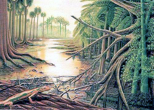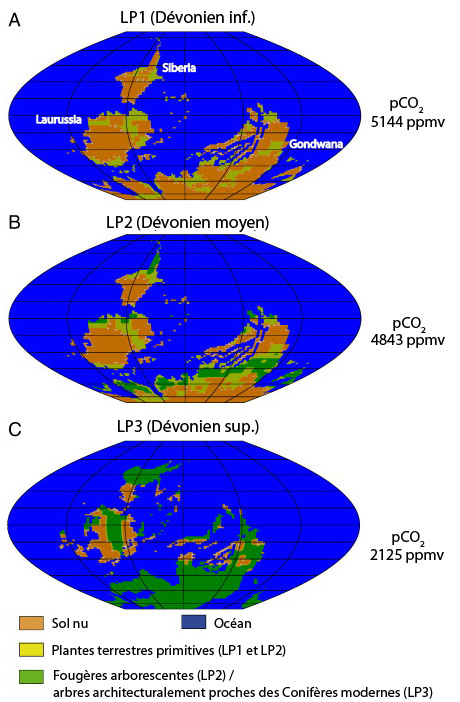 Tout au long de la deuxième moitié du Paléozoïque, avec l'apparition de l'arbre, les forêts colonisent les terres émergées. Elles construisent un nouveau type d'écosystème producteur d'une importante biomasse. Son influence sur le climat, par la fixation de grande quantité de CO2 régulièrement fossilisé dans le lithosphère, a certainement participé au refroidissement important qui marque la fin du Dévonien - début du Carbonifère.